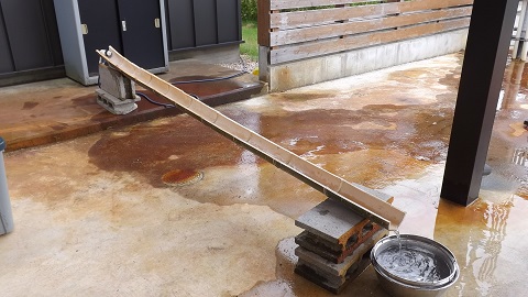 続けて、割った竹の内面にある節(ふし)を砕きます。 砕いたあと、小刀で 入念に段差を削り取ります。 (あとで実際に試してみると、節の部分に ちょっとした段差が残っていても、そこに そうめんが 引っかかったりもしました。何度か実際に そうめんを流してみて 試しながら、削りなおしました) |